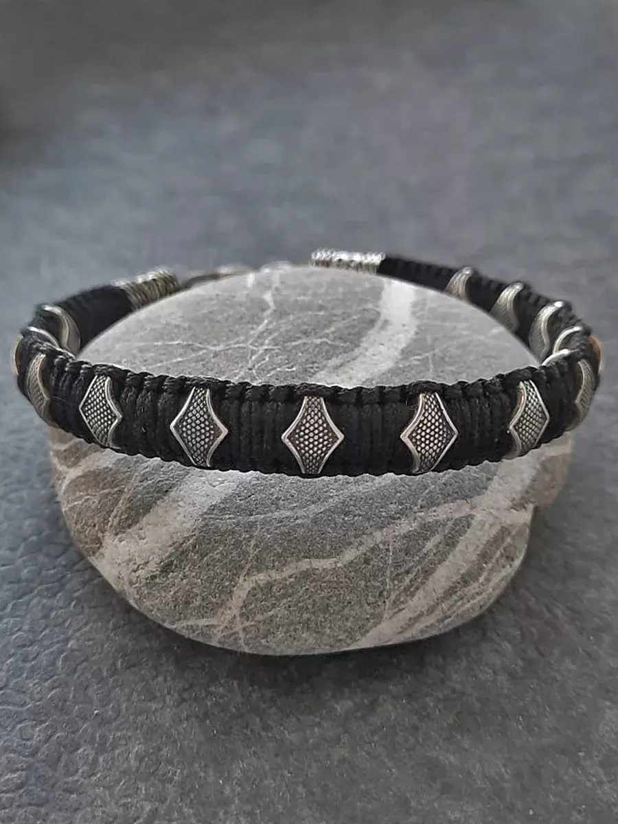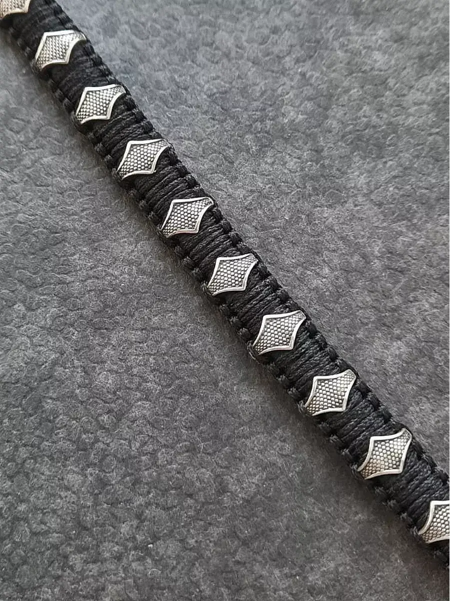 Браслет выполнен из оксидированного серебра на основе из каучукового шнура. Наружная оплетка - нити паракорда черного цвета. Браслет имеет замок-карабин - самый надежный вариант фиксации цепей и браслетов. Обратите внимание на особенность подбора размера браслета: Так как браслет достаточно плотный и объемный, он прилегает к руке не так, как тонкая цепочка или нитка. Поэтому советуем Вам при выборе размера добавлять 1-1,5 см к тому размеру, к которому Вы привыкли. Если Вы подбираете подарок, то к браслету уже идет подарочный холщовый мешочек.
