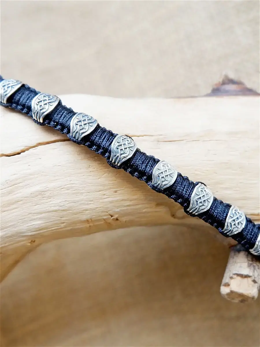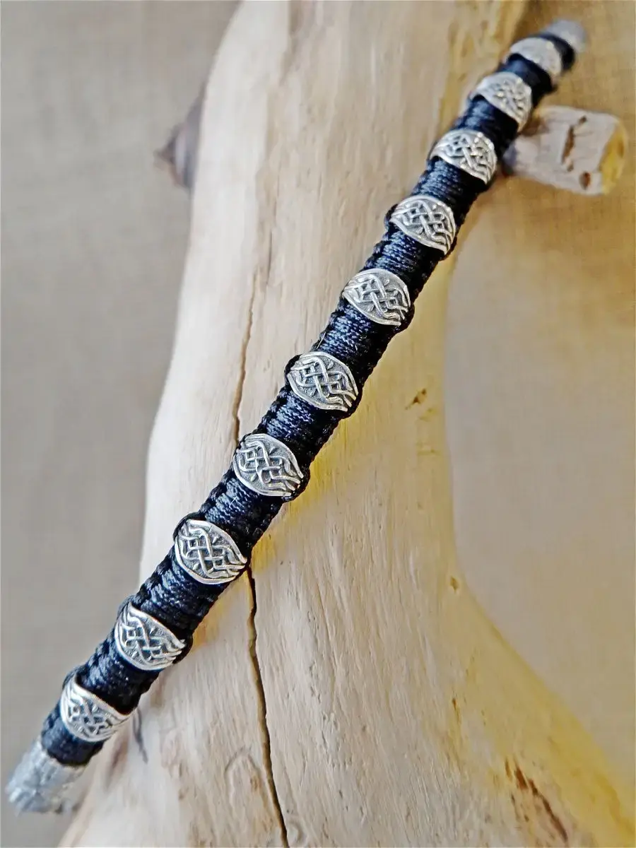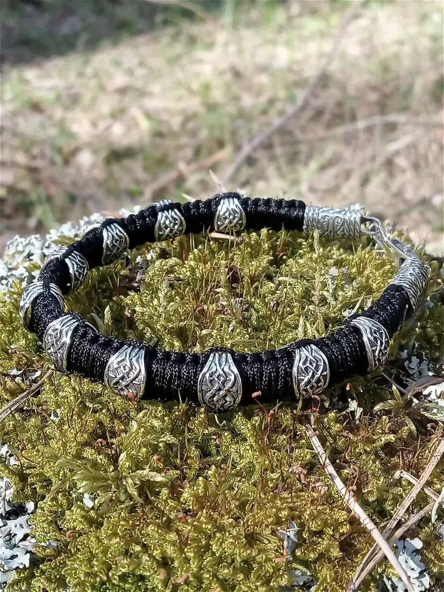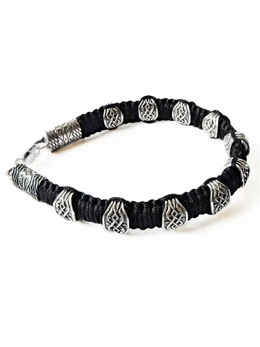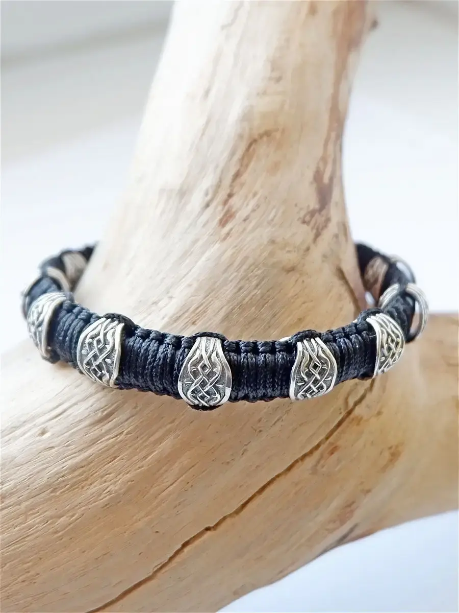 Браслет выполнен из оксидированного серебра на основе из каучукового шнура. Наружная оплетка - нити паракорда черного цвета. Браслет имеет замок-карабин - самый надежный вариант фиксации цепей и браслетов. Обратите внимание на особенность подбора размера браслета: Так как браслет достаточно плотный и объемный, он прилегает к руке не так, как тонкая цепочка или нитка. Поэтому советуем Вам при выборе размера добавлять 1-1,5 см к тому размеру, к которому Вы привыкли. Если Вы подбираете подарок, то к браслету уже идет подарочный холщовый мешочек.