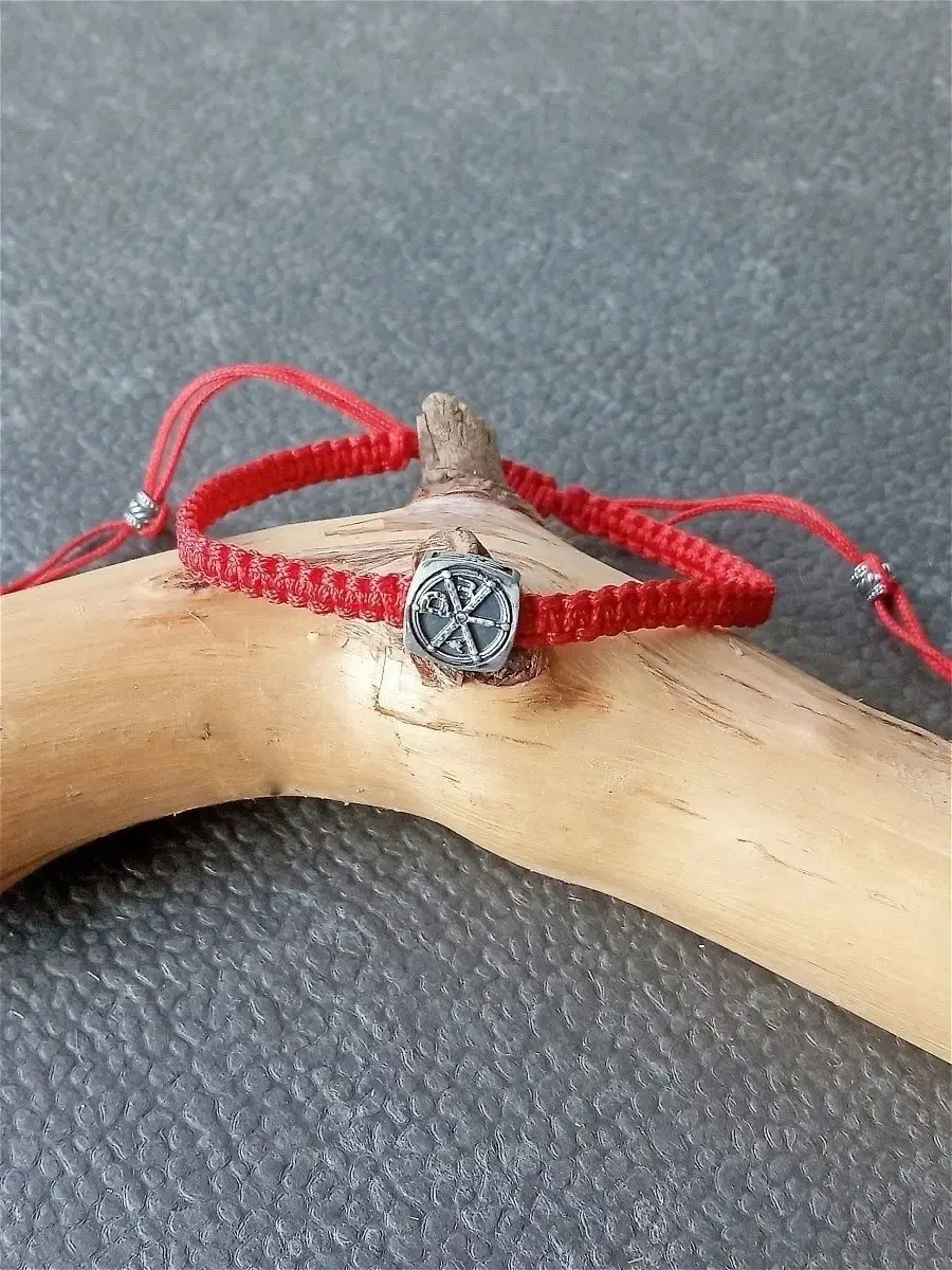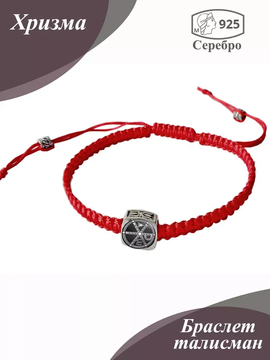Браслет на красной нити. Декоративная вставка выполнена из серебра 925 пробы, покрытие Ceramix. На вставке нанесена Хризма - монограмма имени Христа. Шнур красный нейлоновый круглый диаметром 1 мм. Размер браслета регулируется в пределах от 16 до 20 см. Ручное плетение и обработка. Вес серебра в браслете 2,52 грамма. Оттенки цвета на фото и указанные характеристики являются усредненными и могут незначительно отличаться от фактических.