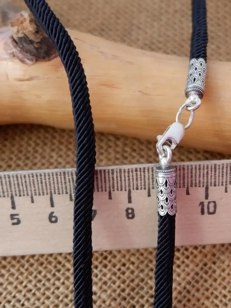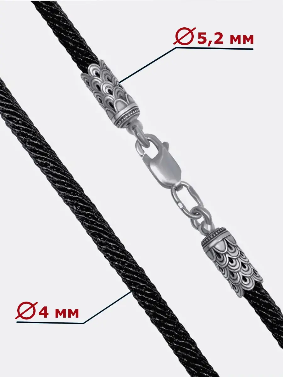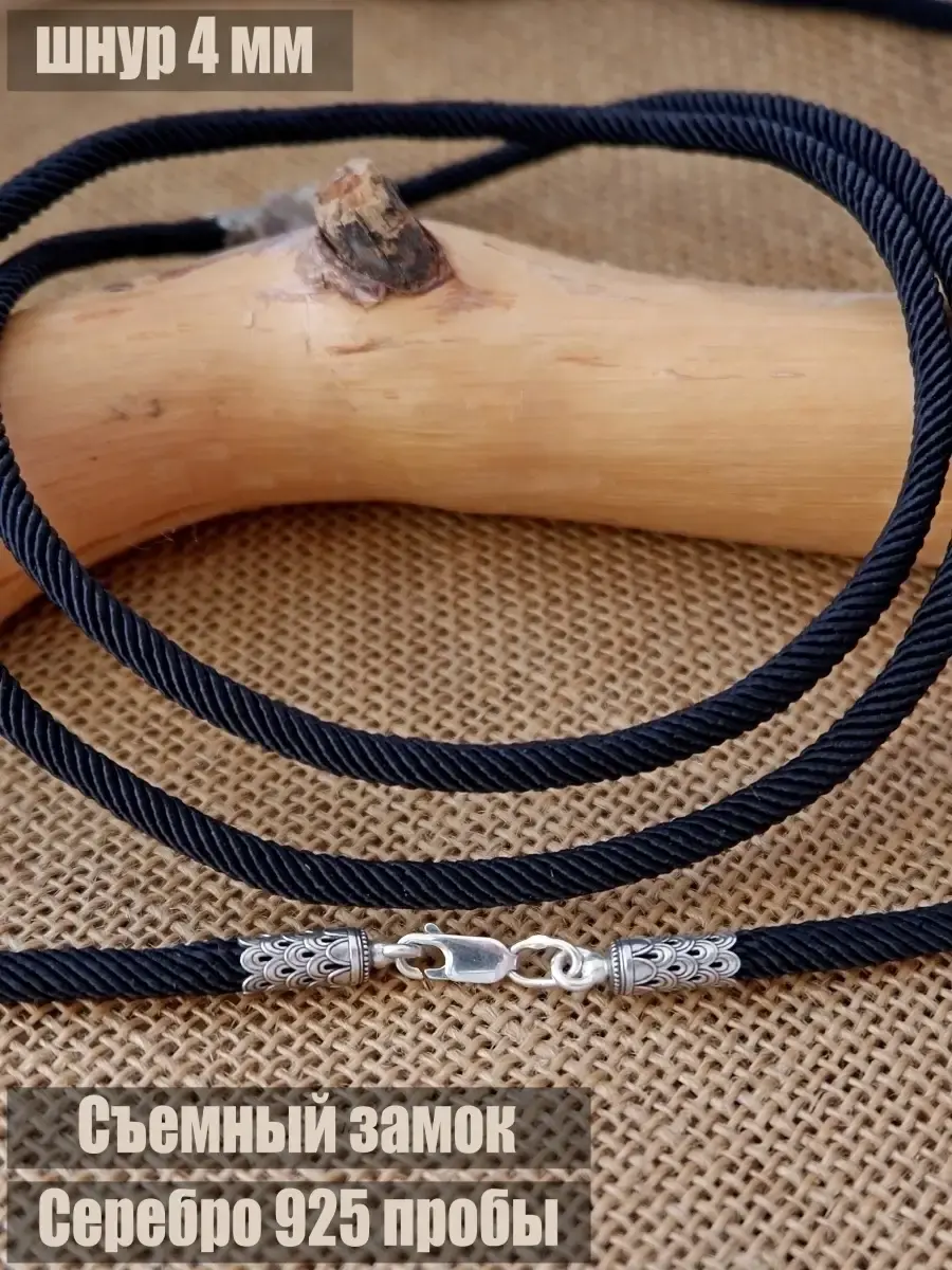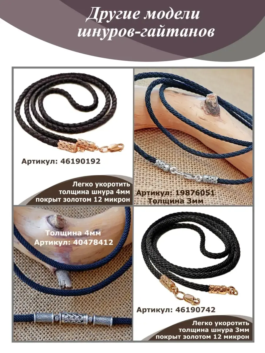 Шнур с серебряными концевиками. Длина 65 сантиметров. Есть возможность самостоятельно укоротить шнур до нужной длины, вывернув замок с гильзой (концевик шнура выворачивается за колечко против часовой стрелки). Гайтан-шнурок текстильный регулируемый диаметром 4 мм со вставками из серебра 925 пробы. Толщина шнура 4мм. Замок съемный, благодаря чему можно легко продеть шнурок в крест или подвеску, либо слегка убавить длину шнура. Вес серебра в изделии: 3,8-3,9 грамма. Может использоваться как самостоятельное украшение, либо как шнурок для кулона, шнур для крестика.