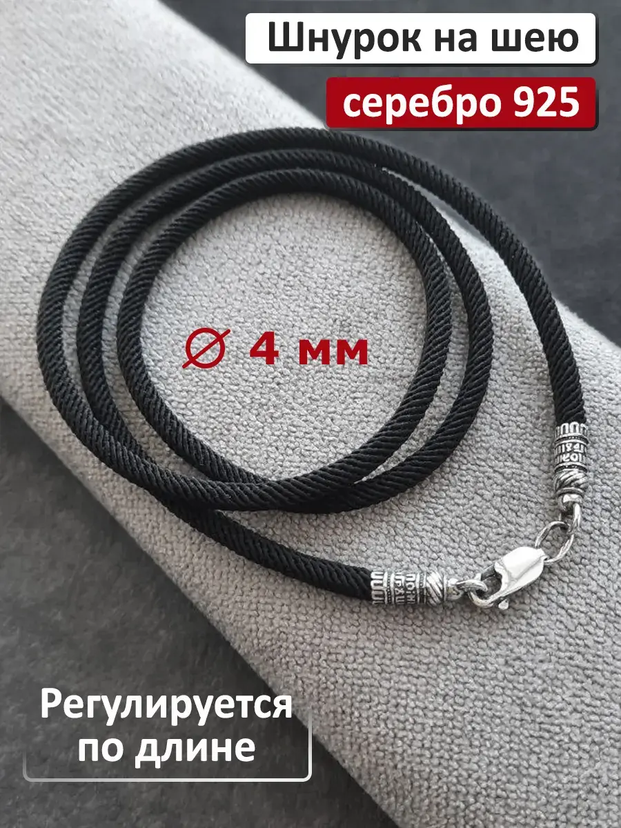 Длина гайтана 70 сантиметров. Есть возможность самостоятельно укоротить шнур до нужной длины, вывернув замок с гильзой (концевик шнура выворачивается за колечко против часовой стрелки). Гайтан-шнурок текстильный регулируемый диаметром 4 мм со вставками из серебра 925 пробы. Толщина шнура 4мм. Замок съемный, благодаря чему можно легко продеть шнурок в крест или подвеску, либо слегка убавить длину шнура. Вес серебра в изделии: 3,8-3,9 грамма. Может использоваться как самостоятельное украшение, либо как шнурок для кулона, шнур для крестика.