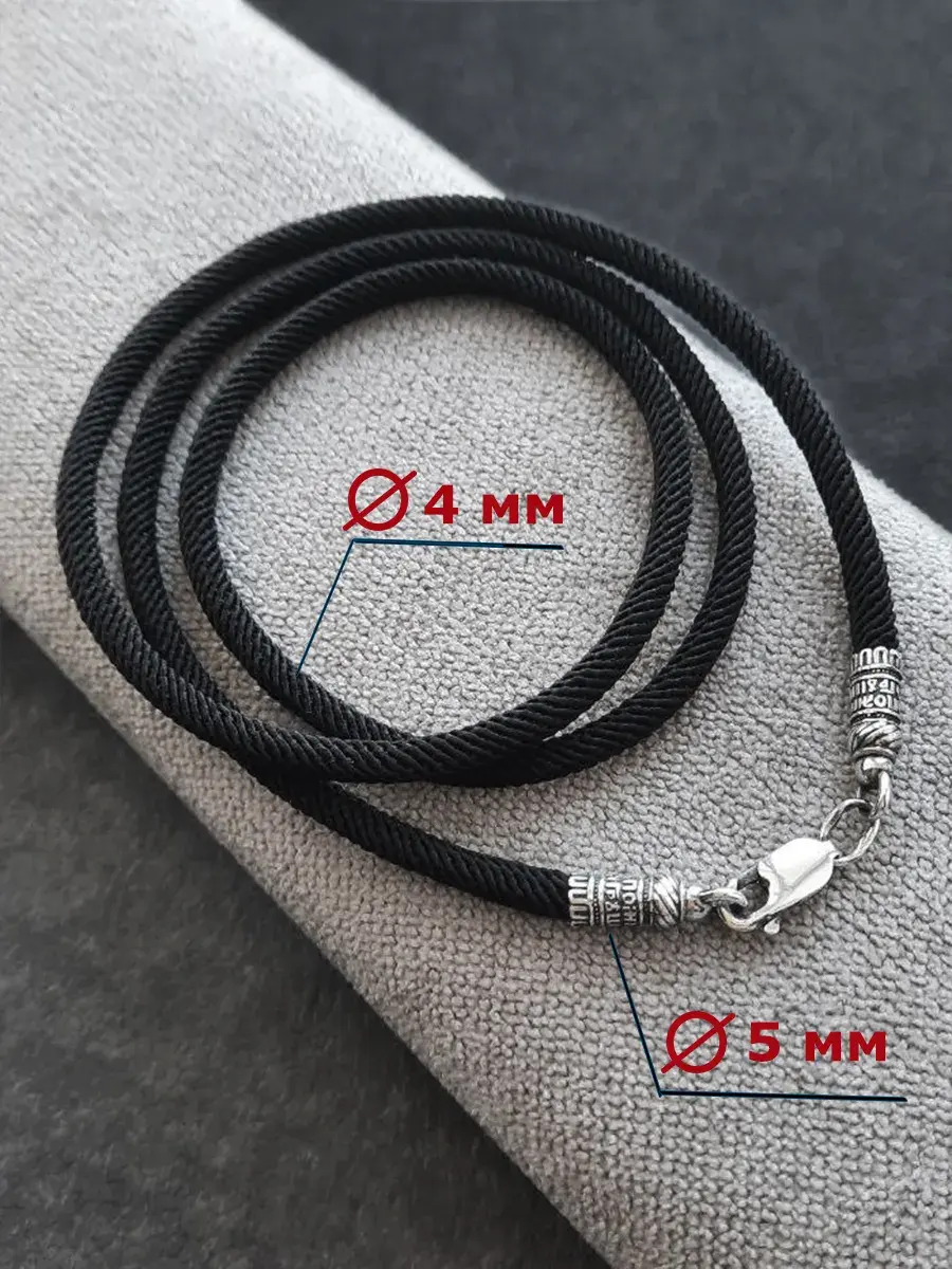Универсальный ювелирный шнур, который подойдет под 90% серебряных крестов и подвесок. Шнур с серебряными концевиками. На серебряных оконцовках надпись на старорусском: "Господи, помилуй меня грешного".