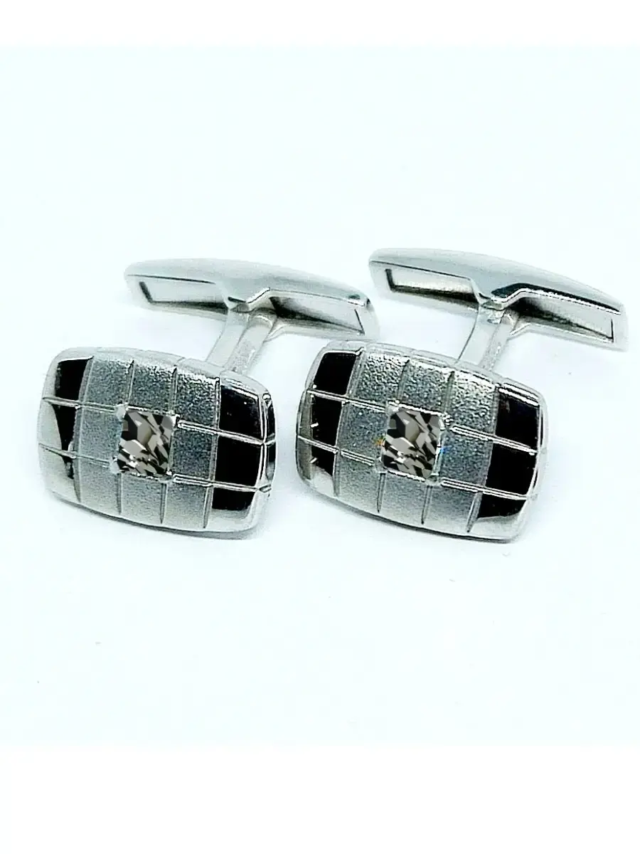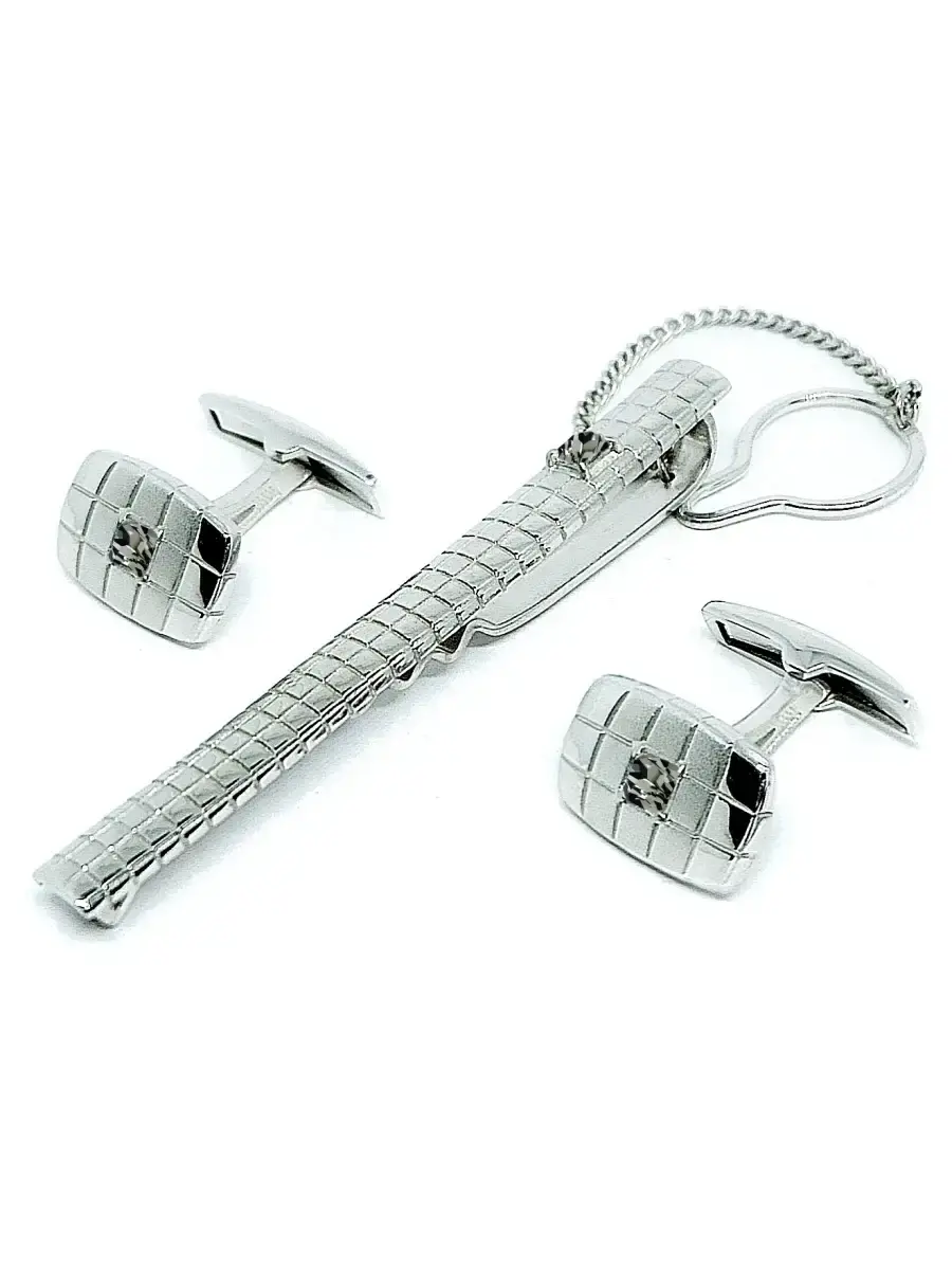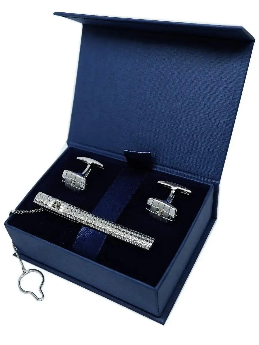 Комплект зажим для галстука + запонки выполнен из Российского серебра 925 пробы. Размер лицевой части зажима 59х6мм, размер лицевой части запонок 15х9мм. В данной модели запонок и зажима для галстука в качестве вставки используется квадратный фианит очень красивого цвета 'черный бриллиант'. Лицевая поверхность ювелирных украшений частично матирована, что усиливает контраст и блеск камней.Украшения поставляются в оригинальной подарочной упаковке с логотипом производителя и магнитным замком. Такой футляр отлично подходит как для хранения, так и в виде подарочной упаковки. Размер футляра: 85х62х27мм.
