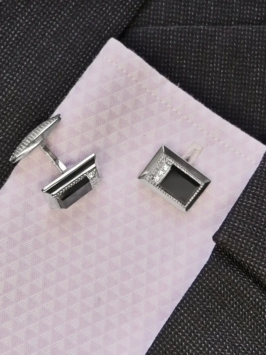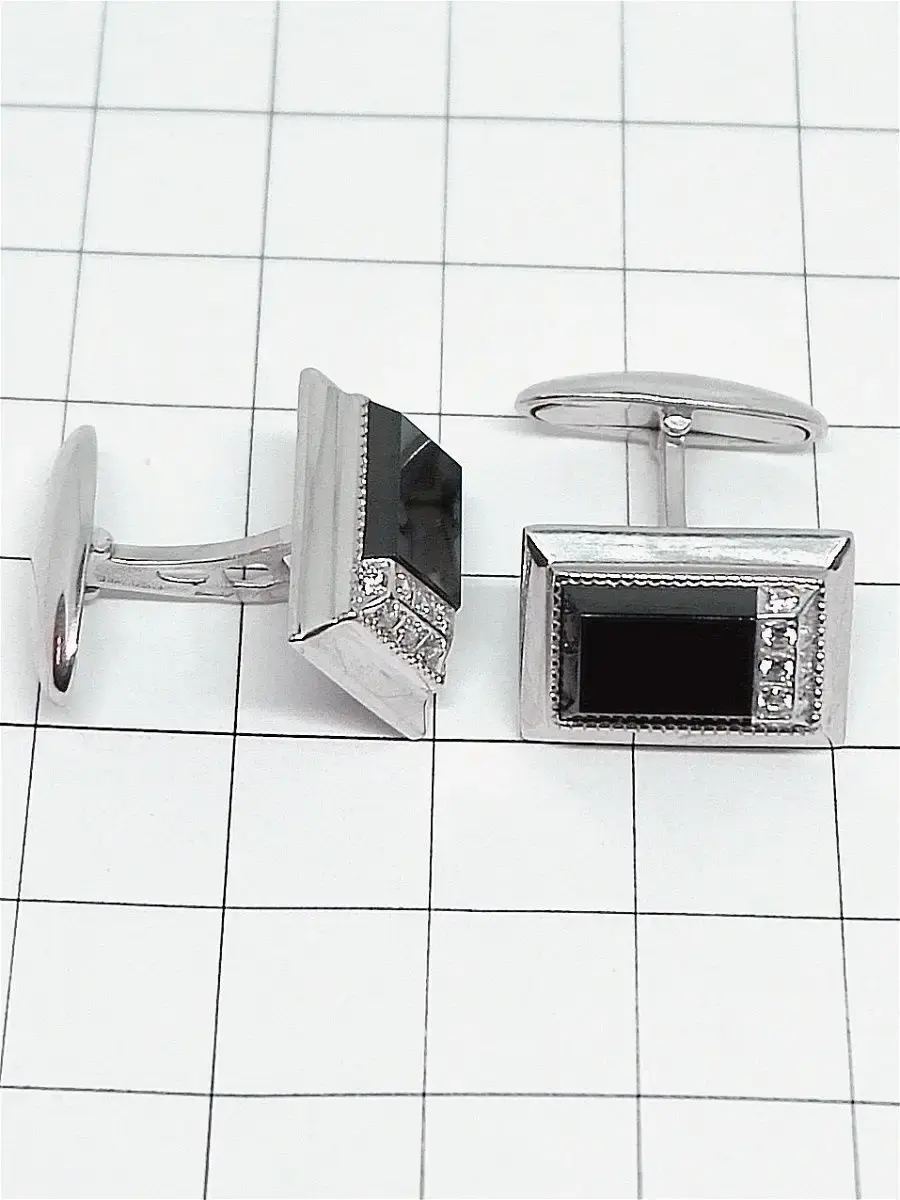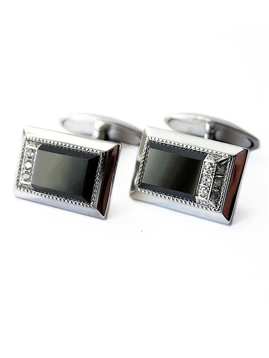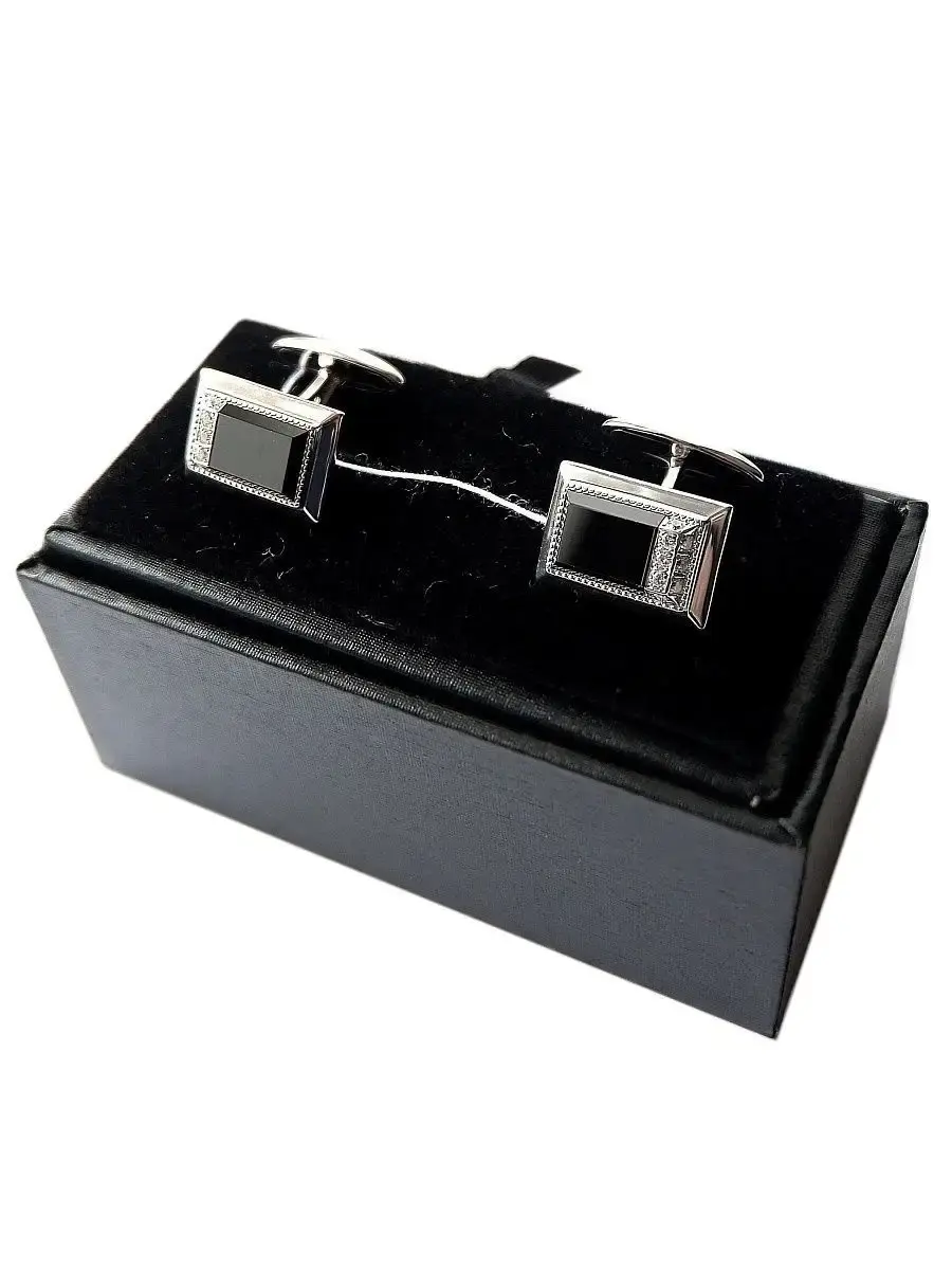Классические запонки прямоугольной формы с острыми гранями из серебра 925 пробы и фианитами. Эффектное сочетание черного фианита багетной огранки и россыпи бесцветных круглых фианитов. Размер лицевой части: 16х12 мм. 8 бесцветных фианитов, 1 черный фианит багетной огранки. Запонки поставляются в подарочной упаковке. Средний вес: 8,2 грамма