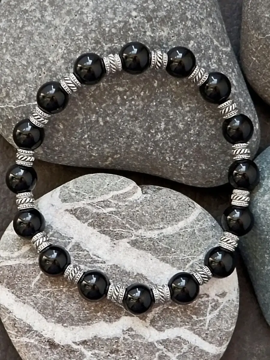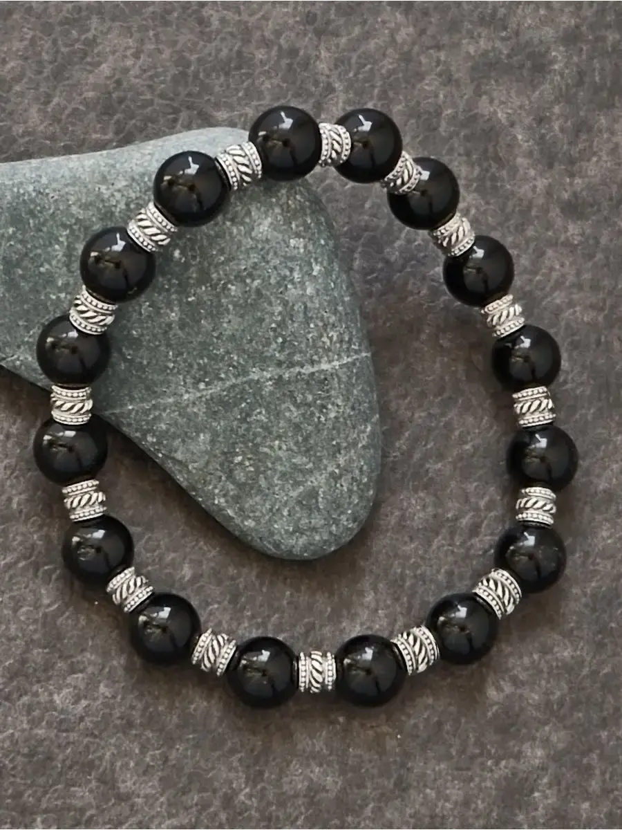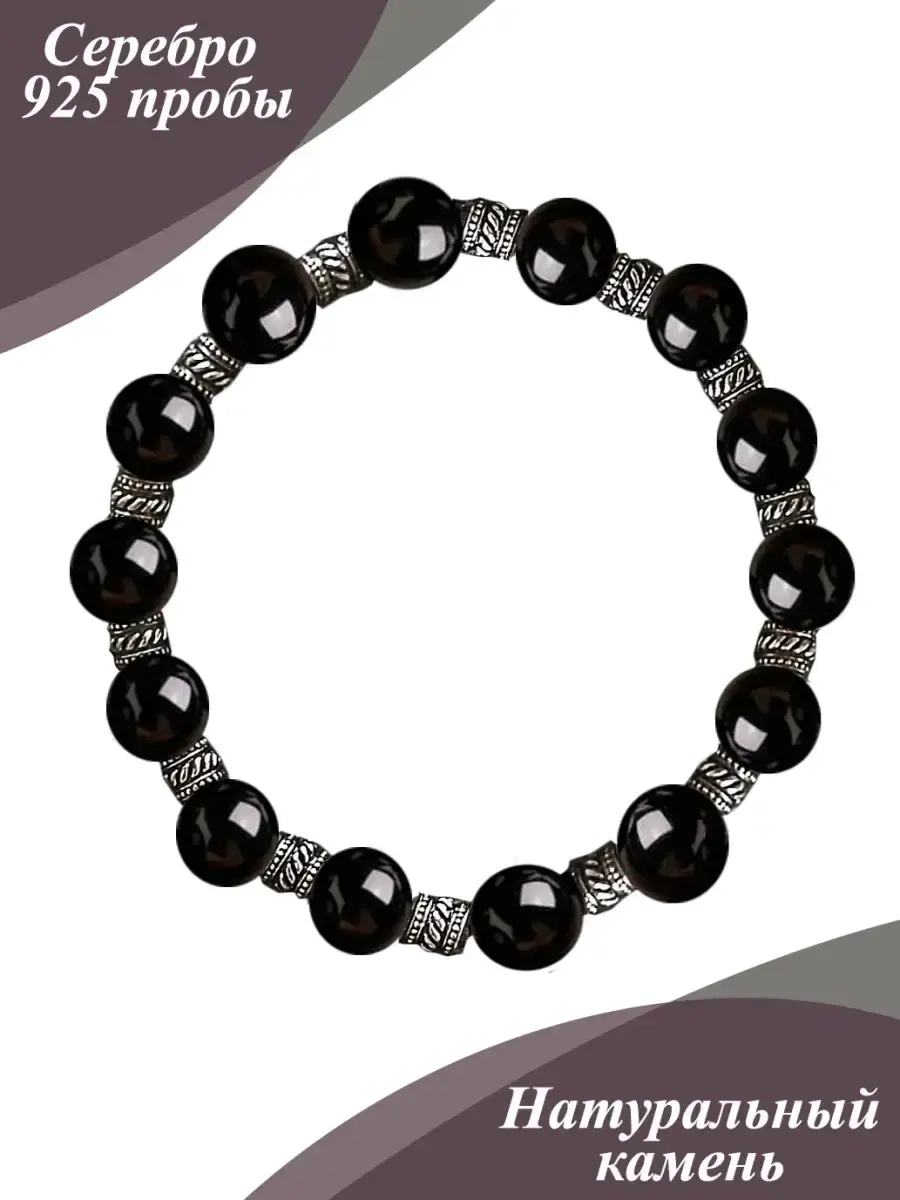 Браслет из камней со вставками из серебра 925 пробы и гидротермальным черным агатом. Диаметр бусин 8 мм. Размер и внешний вид бусин могут незначительно отличаться друг от друга и от фото из-за природного происхождения камня и ручной обработки. Браслет собран без замка на эластичной износостойкой нитке, быстро и легко надевается и снимается с руки. Браслет можно носить и как мужской, и как женский, а также как парный браслет. Чёрный агат - энергетический камень, улучшает мыслительные процессы, помогает преодолеть невнимательность, усиливает концентрацию и сосредоточенность на чём-то одном. Улучшается восприимчивость, повышаются аналитические способности, и появляется способность к логическому мышлению. Астрологи рекомендуют использовать чёрный агат как амулет, защищающий от негатива и способный увеличивать жизненную энергию и силу.