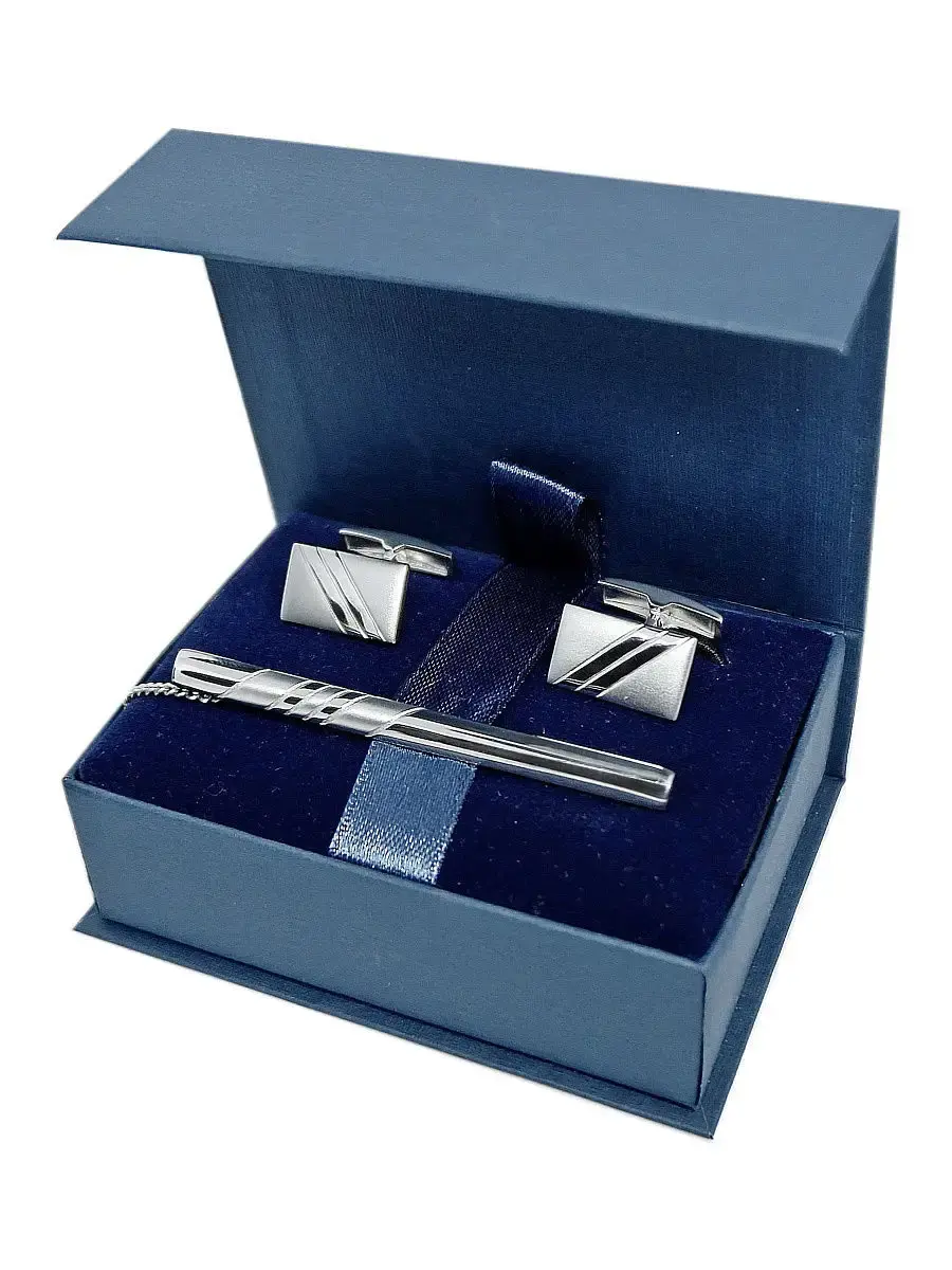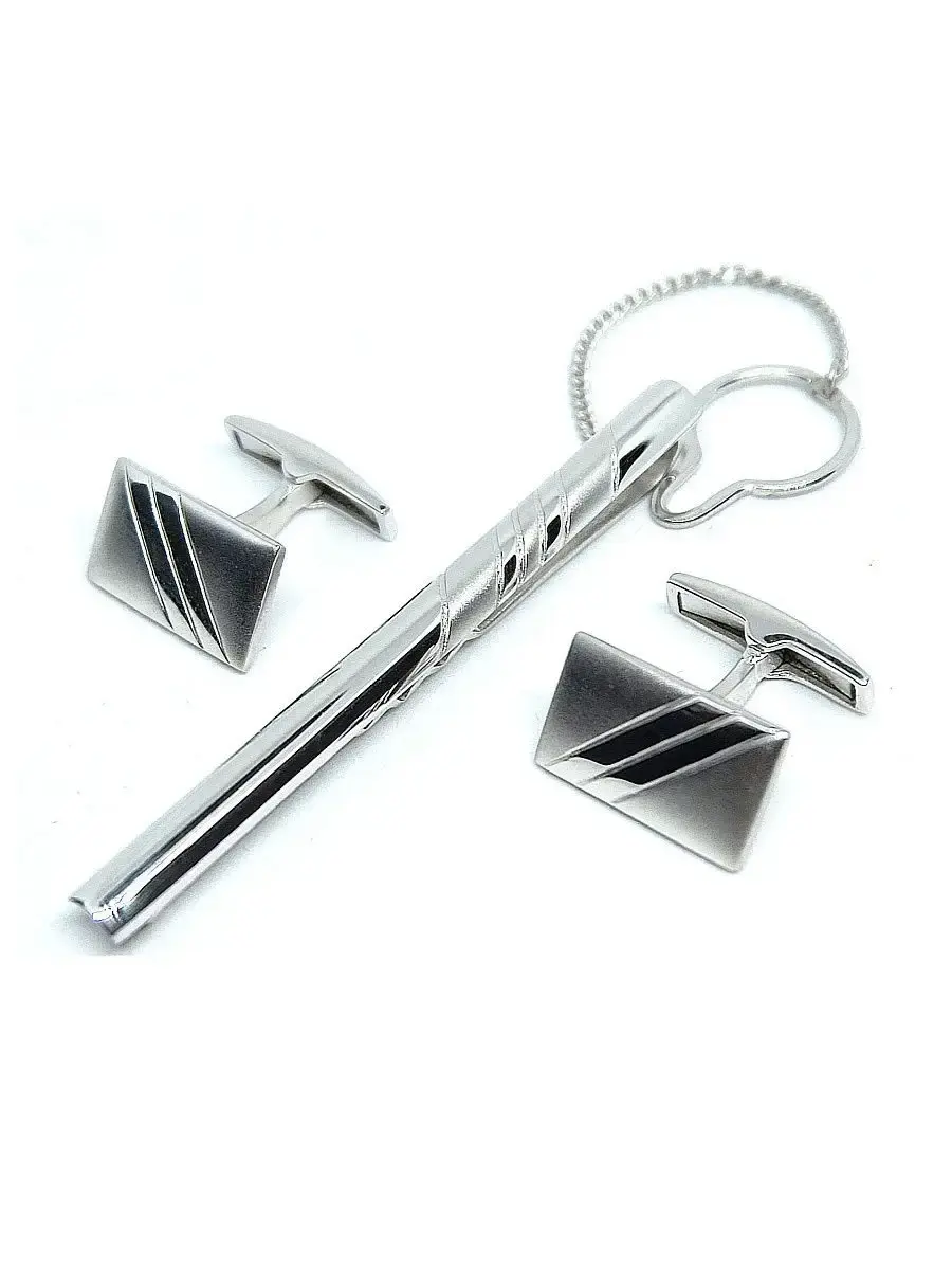 Ювелирный комплект, состоящий из зажима для галстука и запонок. Идеальное дополнение любого делового костюма. Подходит для ежедневного использования. Также идеально подойдет как подарок учителю, руководителю, начальнику, либо себе любимому )). Размер лицевой части зажима 60х5мм, размер лицевой части запонок 16х10мм, размер подарочной упаковки 75х55х28мм. Каждое ювелирное украшение имеет именник производителя и клеймо, подтверждающее 925 пробу серебра.