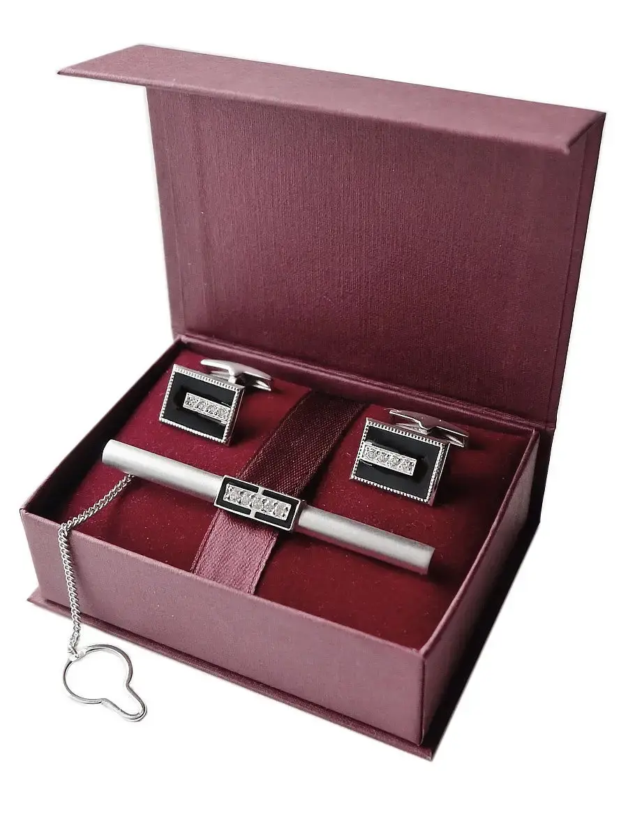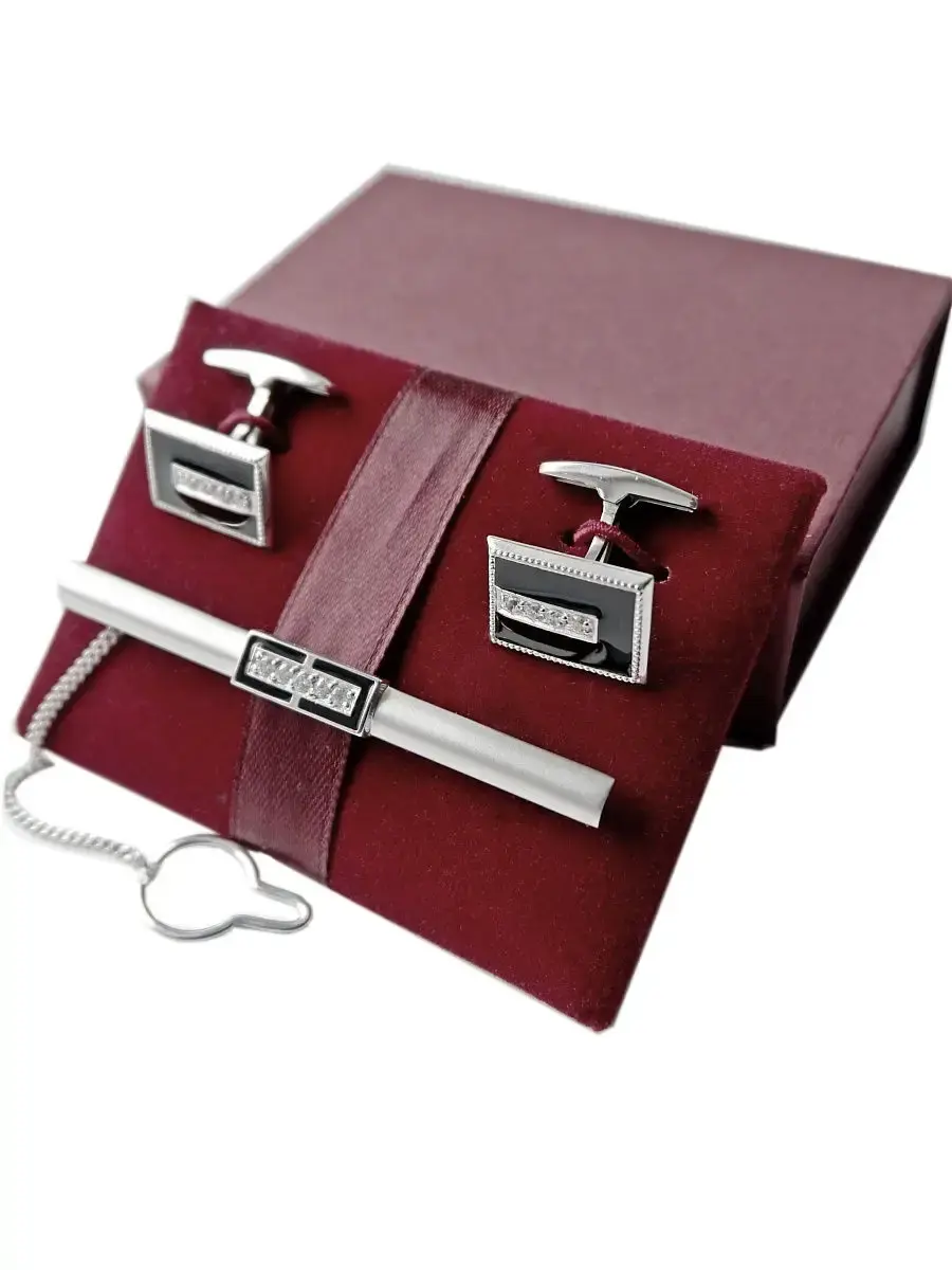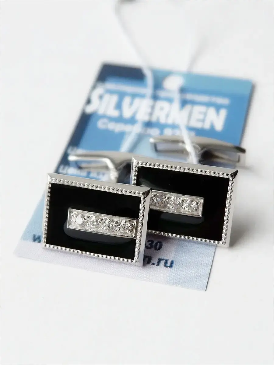 Стильный и недорогой подарок, состоящий из запонок и зажима для галстука, помещенных в футляр. Комплект зажим для галстука + запонки выполнен из Российского серебра 925 пробы. Размер лицевой части зажима 65х6мм, размер лицевой части запонок 16х12 мм. В данной модели запонок и зажима для галстука в качестве вставки используется фианит и английская черная эмаль. Лицевая поверхность ювелирных украшений частично матирована, что усиливает контраст и блеск камней. Украшения поставляются в оригинальной подарочной упаковке с логотипом производителя и магнитным замком. Такой футляр отлично подходит как для хранения, так и в виде подарочной упаковки. Размер футляра: 85х62х27мм. В нашем магазине всегда можно найти мужской подарок: запонки из серебра, серебряный зажим для галстука, мужской комплект, запонки серебро.
