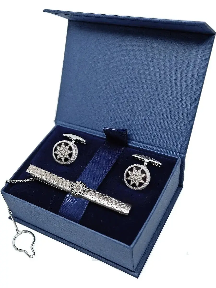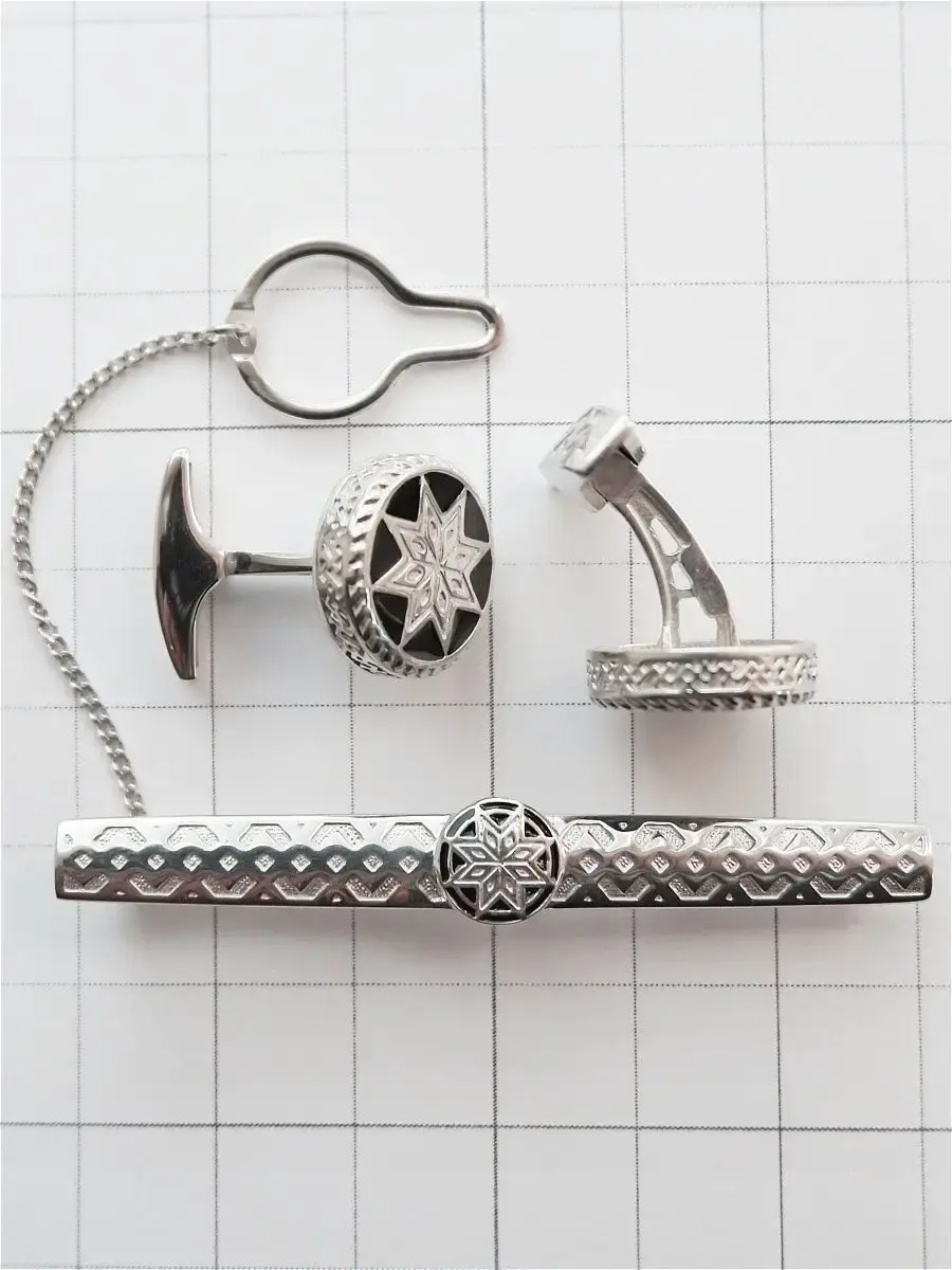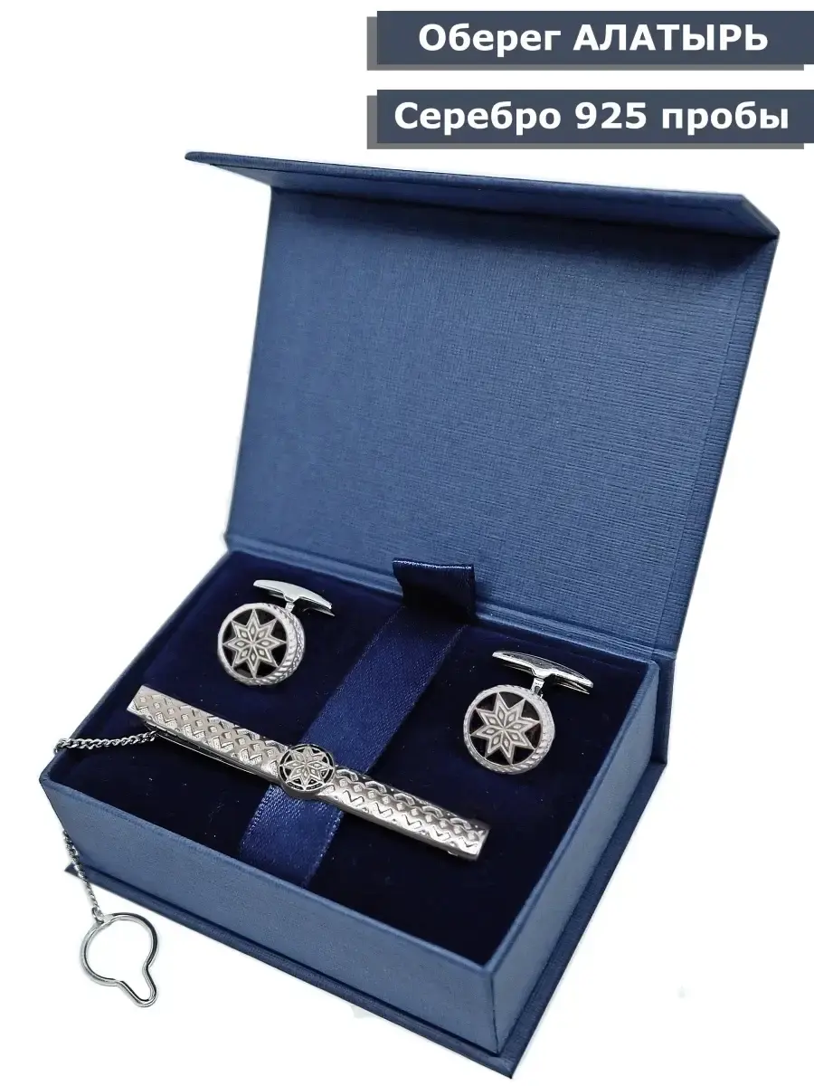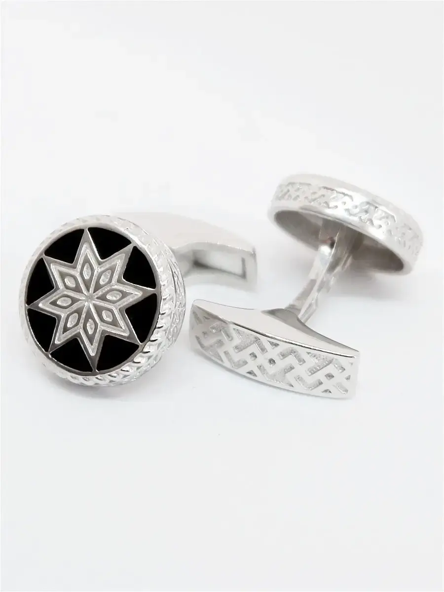 Комплект, включающий в себя ювелирные запонки и зажим для галстука с черной английской эмалью. Рисунок на лицевой поверхности - древний славянский символ Алатырь. Считается, что АЛАТЫРЬ наделен уникальными магическими свойствами - отражает негативную энергию, направленную на разрушение душевной сущности человека, а также ограждает носителя данного символа от различных хворей и недомоганий.Такие круглые ювелирные запонки будут органично смотреться и на официальных мероприятиях и при работе в офисе, отлично подойдут для ежедневного ношения. Запонки из серебра 925 пробы имеют поворотный механизм, для удобства пользования фиксирующийся в двух положениях. Диаметр лицевой части ювелирных запонок 16мм. Серебряный зажим для галстука не имеет пружины и удерживает галстук за счет упругости металла (по типу заколки-невидимки). Размер лицевой части зажима 64х8мм. Размер подарочной упаковки 75х55х28мм. В нашем ассортименте есть: ювелирные запонки, запонки из серебра 925 пробы, славянские запонки.