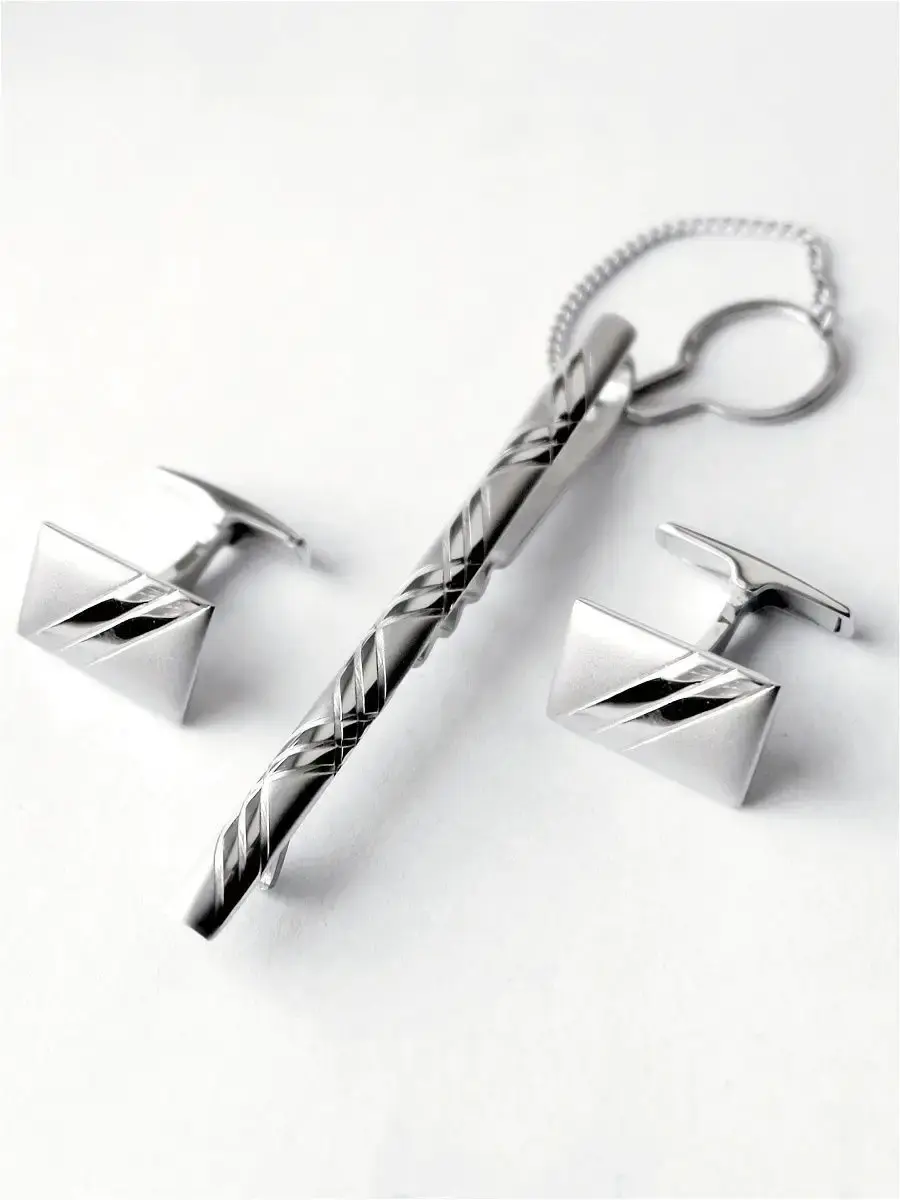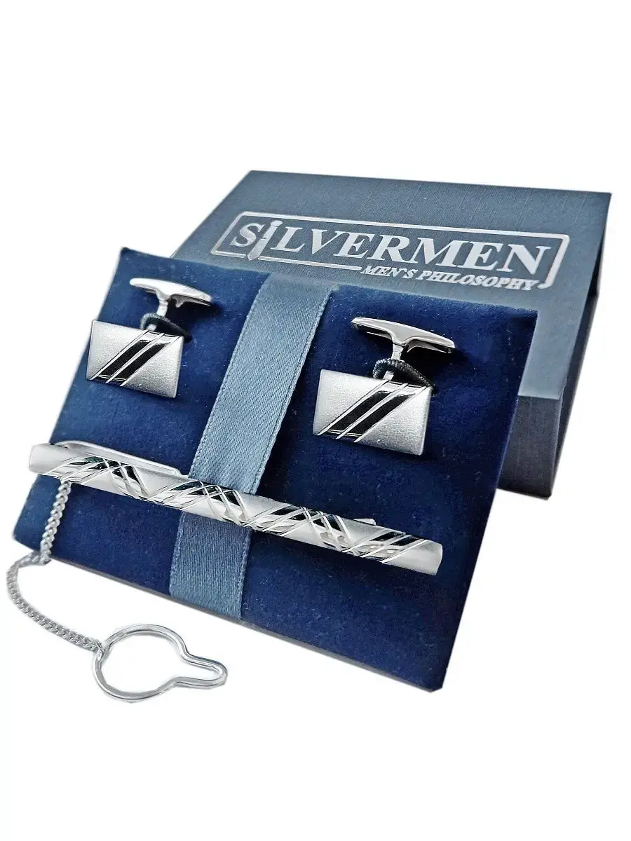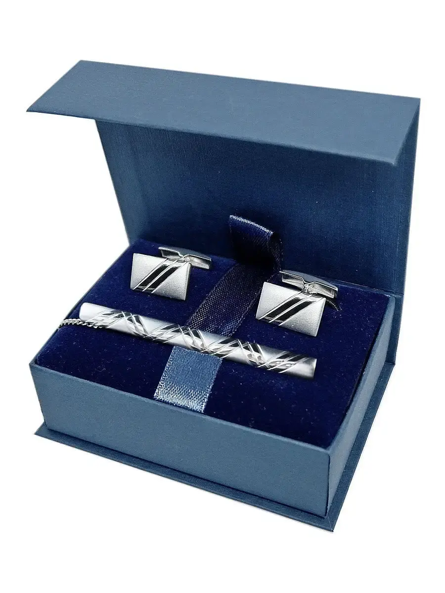 Мужской подарочный комплект, состоящий из серебряных запонок и зажима для галстука. Российское серебро 925 пробы имеет все необходимые сертификаты и соответствует заявленной пробе. Частичная пескоструйная обработка для выделения фактуры. Средний вес запонок: 6 грамм, зажима - 5 грамм. Размер лицевой части зажима 60х5мм, размер лицевой части запонок 15х9мм. Поставляется в подарочной упаковке (футляре) с магнитным замком. Размер футляра: 85х60х28мм.