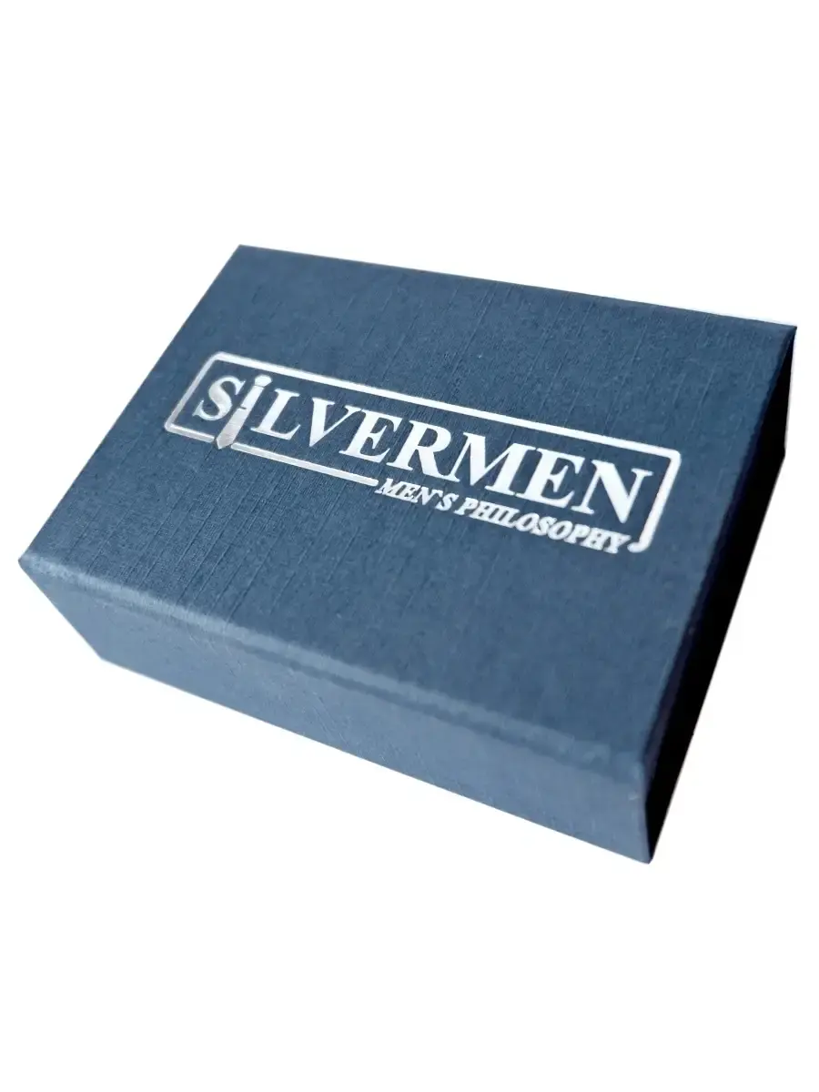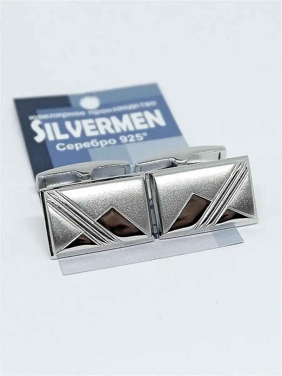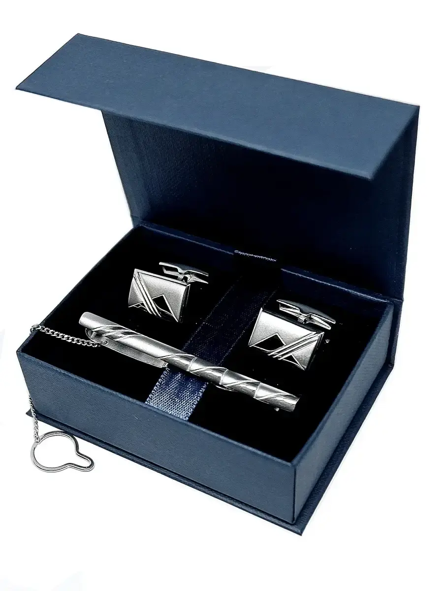 Ювелирный комплект из серебра 925 пробы, для мужчин. Состоит из серебряных зажима для галстука и запонок. Идеальное дополнение любого делового костюма. Размер лицевой части зажима 60х5мм, размер лицевой части запонок 16х10 мм, размер подарочной упаковки 75х55х28мм. Изделия полностью состоят из серебра 925 пробы, без вставок. Игра света и тени достигается чередованием матовой и глянцевой поверхности. Каждое ювелирное украшение имеет именник производителя и клеймо, подтверждающее 925 пробу серебра. Средний вес комплекта: 11,3 грамма. Комплект поставляется в брендированом футляре. Цвет футляра может быть произвольным