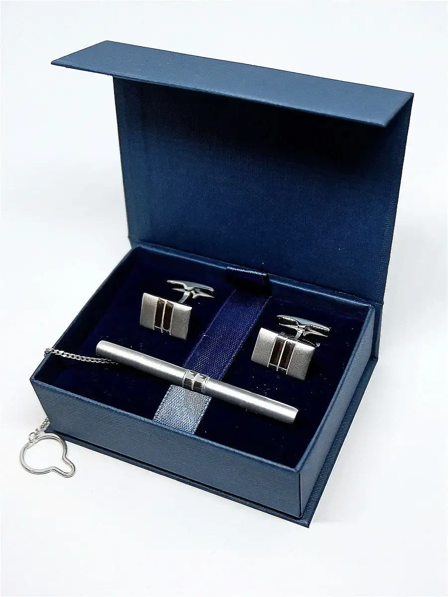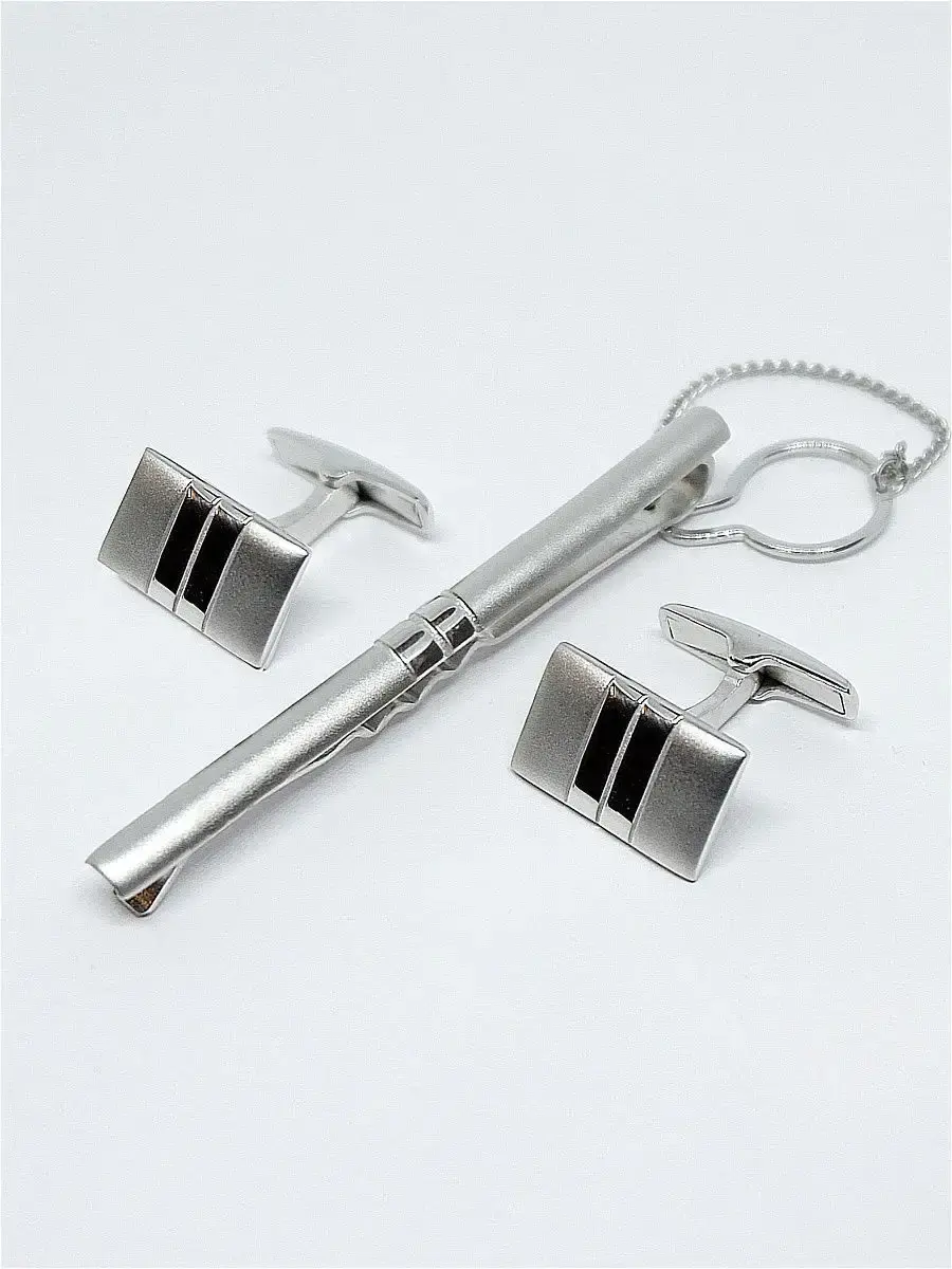 Ювелирный комплект, состоящий из зажима для галстука и запонок. Идеальное дополнение любого делового костюма. Подходит для ежедневного использования Размер лицевой части зажима 60х5мм, размер лицевой части запонок 16х10мм, размер подарочной упаковки 75х55х28мм.