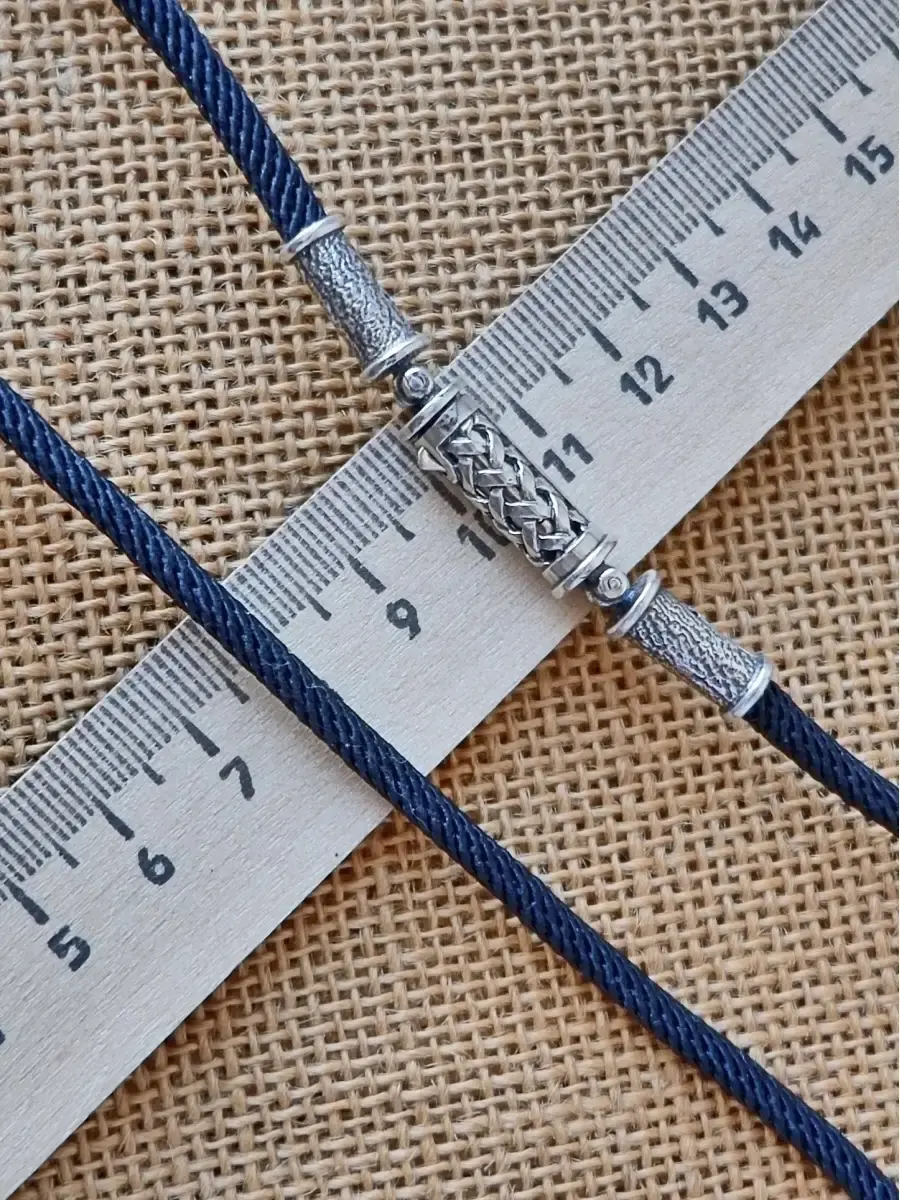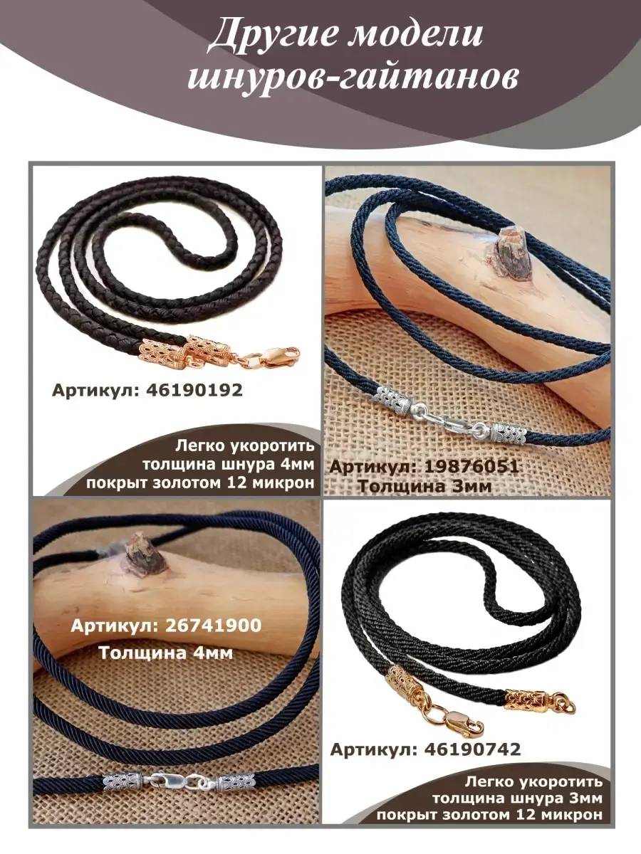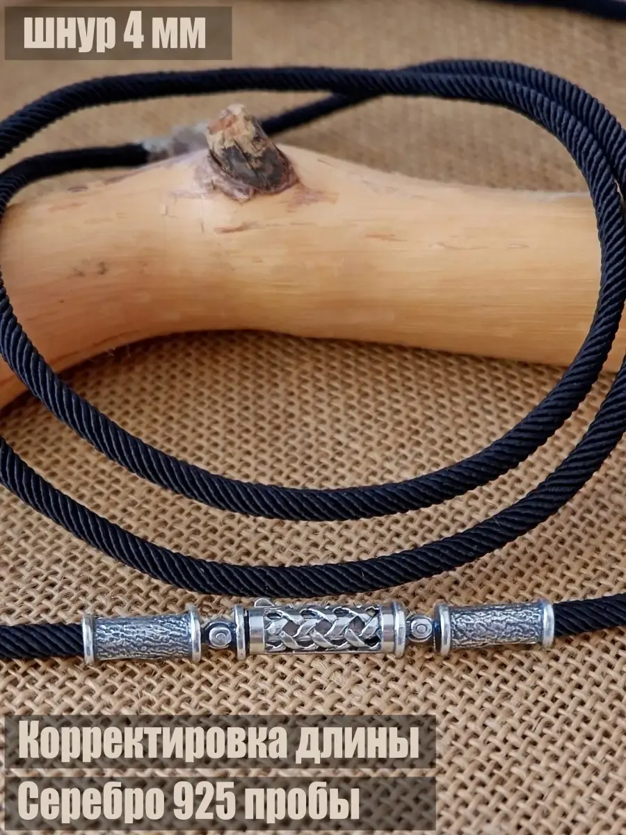 Серебряный гайтан (ювелирный черный шнур) регулируемый, с литым замком и оконцовками из серебра 925 пробы. Шнурок черный, не боится воды и влаги, устойчив к истиранию, очень крепкий и прочный. Особенностями данной модели являются оригинальный замок и возможность быстрой замены серебрянных оконцовок, благодаря чему можно легко продеть шнурок в крест или подвеску, либо слегка убавить длину шнура. Вес серебра в изделии: 9,7-10,1 грамма. Толщина шнура 4 мм. Длина шнура: 65 см. Гайтан (ювелирный шнур) можно носить как самостоятельное украшение, так и под нательный крест, подвеску, оберег.