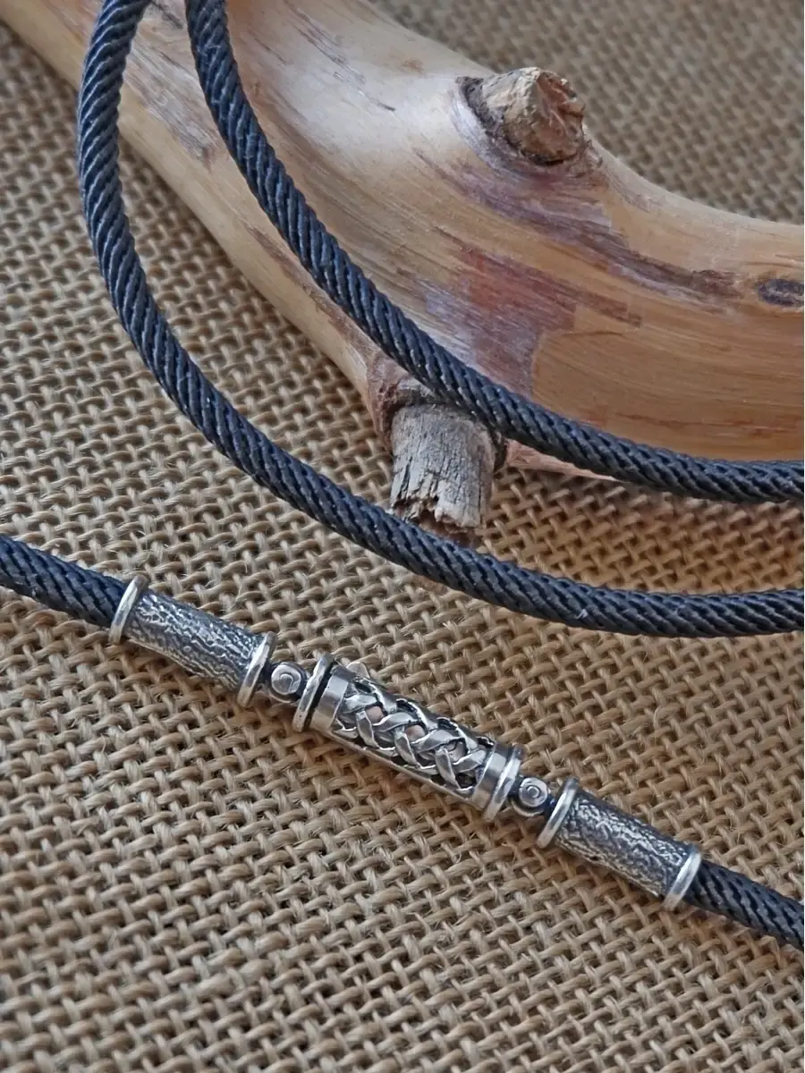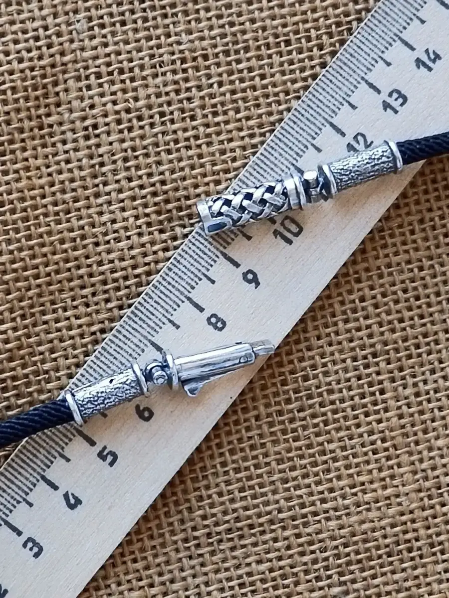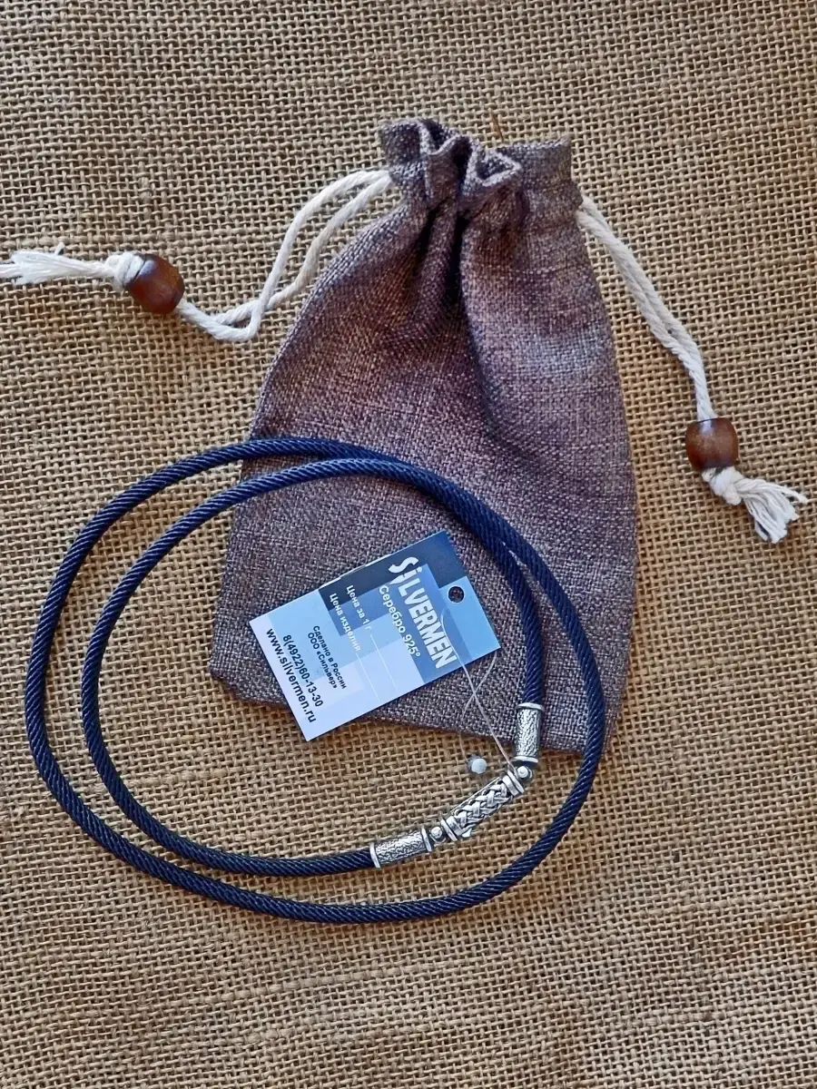 Серебряный гайтан (ювелирный черный шнур) регулируемый, с литым замком и оконцовками из серебра 925 пробы. Шнурок черный, не боится воды и влаги, устойчив к истиранию, очень крепкий и прочный. Особенностями данной модели являются оригинальный замок и возможность быстрой замены серебрянных оконцовок, благодаря чему можно легко продеть шнурок в крест или подвеску, либо слегка убавить длину шнура. Вес серебра в изделии: 9,7-10,1 грамма. Толщина шнура 4 мм. Длина шнура: 65 см. Гайтан (ювелирный шнур) можно носить как самостоятельное украшение, так и под нательный крест, подвеску, оберег.