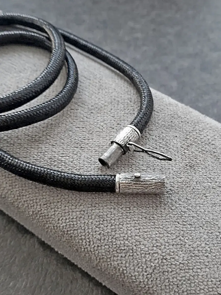 Гайтан изготовлен из высококачественного серебра 925 пробы с оксидированным покрытием, сам шнур обладает изысканным внешним видом и устойчив к воздействию окружающей среды. Серебряные концевики оснащены поворотным механизмом запирания, что обеспечивает цельный и гармоничный внешний вид шнура, а дополнительная страховка предотвращает случайное расстегивание.