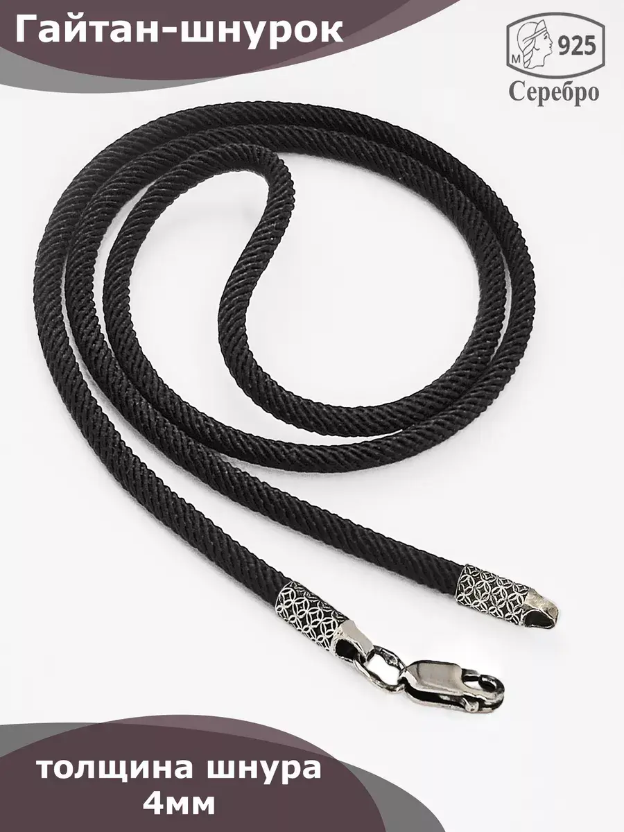 При выборе креста или подвески на шнурок - ушко должно быть не меньше 4,5 мм для шнура толщиной 3мм, и не меньше 5,5 мм - для шнура толщиной 4мм. Вес серебра в изделии: от 3,8 грамма (при толщине шнура 4мм). Надежный, долговечный и невероятно привлекательный шнур-гайтан станет идеальным дополнением к вашим любимым аксессуарам.