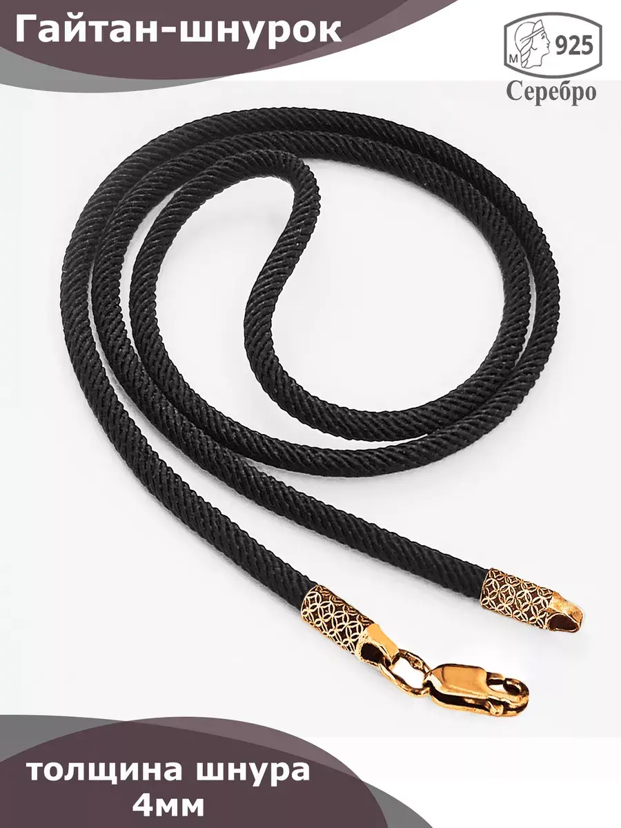 Изящный и надежный шнур-гайтан со вставками из серебра 925 пробы, покрытыми золотом. Изящный шнурок толщиной 4мм станет идеальным обрамлением Вашего нательного креста, создавая завершенный образ. Шнур с золочеными концевиками изготовлен из гипоаллергенного материала, не боится воды и влаги, устойчив к истиранию, не выцветает, не ворсится, не деформируется от намокания. Выбирая мужской гайтан, Вы не просто приобретаете шнурок для крестика - Вы выбираете стильное дополнение к Вашим украшениям. При выборе креста или подвески на шнурок обратите внимание - ушко должно быть не меньше 5 мм - для шнура толщиной 4мм. Вес серебра в изделии не менее 3,8 г. Назначение: шнурок для кулона, шнурок для подвески, гайтан-шнурок.