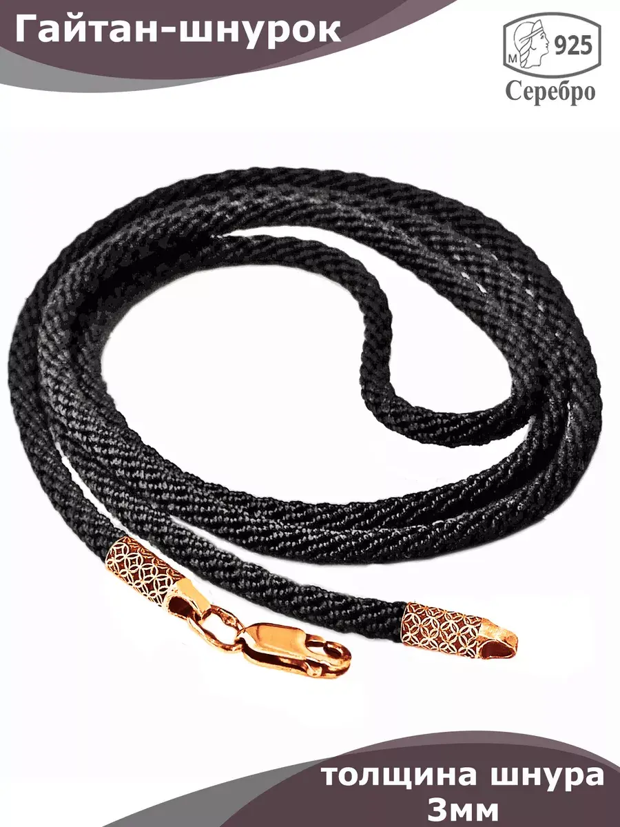 Шнур-гайтан текстильный (Cordura Plus) со вставками из серебра 925 пробы, покрытыми позолотой. Толщина шнура 3мм. Шнур изготовлен из гипоаллергенного материала, не боится воды и влаги, устойчив к истиранию, не выцветает, не ворсится, не деформируется от намокания. Гайтан имеет серебряные концевики, покрытые золотом 585 пробы. Внешний диаметр серебряных концевиков 3,7 мм. При выборе креста или подвески на шнурок - ушко должно быть не меньше 4 мм. Вес серебра в изделии не менее 2,88 грамма (при толщине шнура 3мм). Шнурок для кулона черного цвета, что отлично подойдет как мужчинам, так и женщинам.