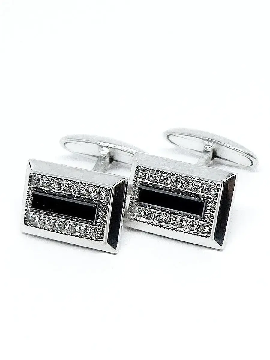 Оригинальные прямоугольные запонки с крупным черным фианитом и дорожками из безцветных фианитов. Размер лицевой пластины: 16х12мм. Подвижный механизм запонки жестко фиксируется в двух положениях для удобства использования. Поставляются в подарочном футляре.